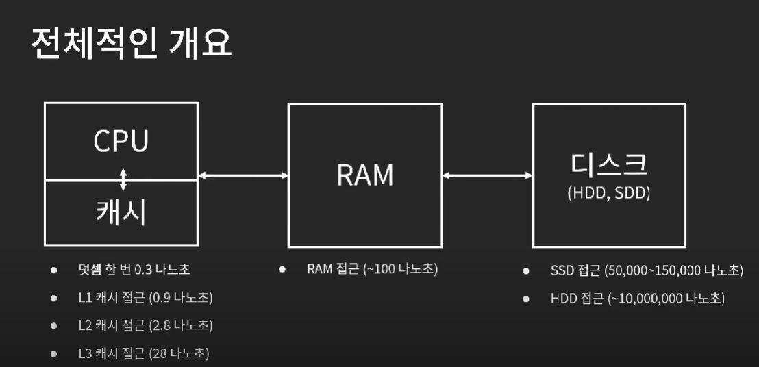 - 램에서 읽는데만 걸리는 시간 : 100나노초