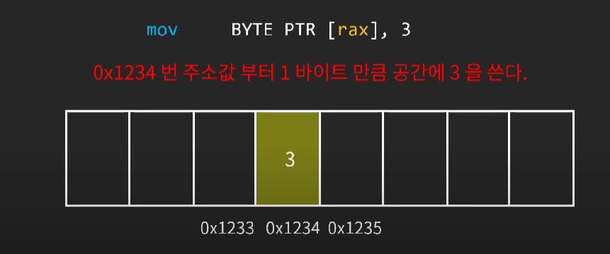 mov BYTE PTR [rax], 3 # mov 는 값을 이동, 복사 시키라는 명령어