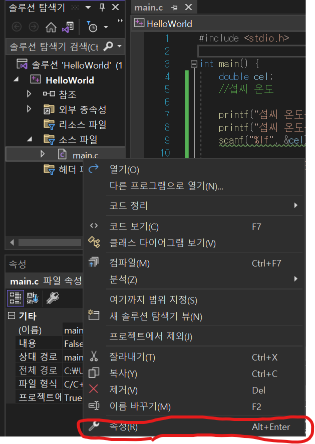 사용중인 소스파일 우클릭 -> 속성 클릭