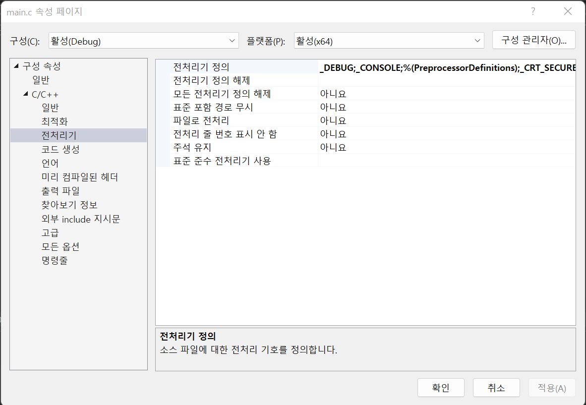 C/C++ -> 전처리기 -> 전처리기 정의 우측칸에 _CRT_SECURE_NO_WARNINGS; 입력후 적용