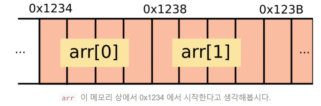 위의 그림은 배열 arr 이 메모리 상에서 어떠한 형태로 존재하는지 그림으로 나타낸 것이다.