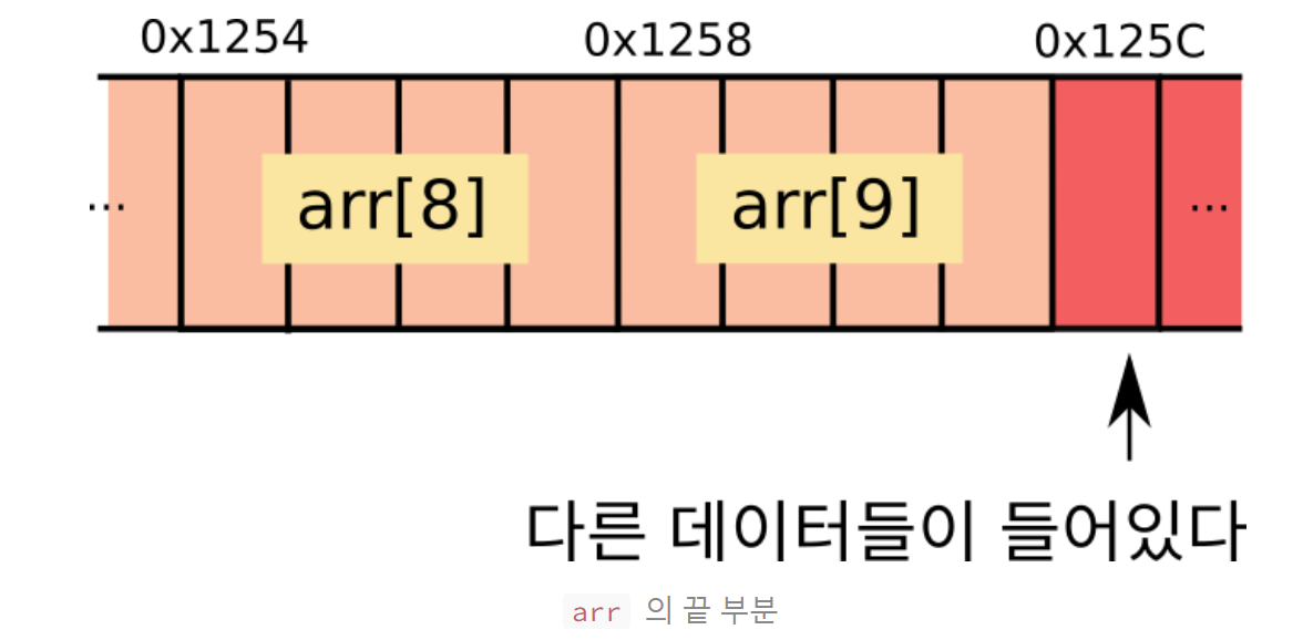위의 그림처럼 배열의 원소중 arr[9] 가 가장 마지막에 있을것이고, 그 뒤의 메모리 부분에는 배열 arr 과 상관없는 다른 데이터가 들어가 있을 것이다.