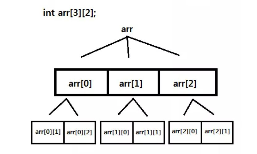 2차원 배열 arr[3][2] 의 첫 번째 원소 : { arr[0][0], arr[0][1] }