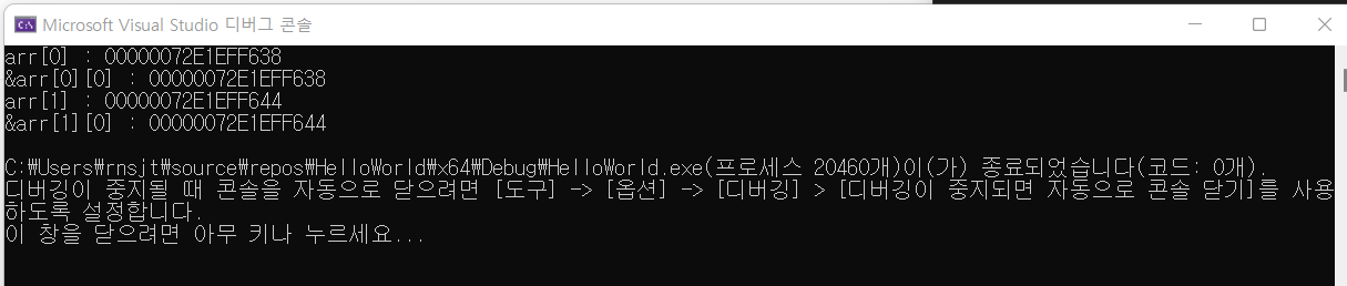 arr[1] 은 arr[1][0] 의 주소값과 같은 것을 볼 수 있다.
