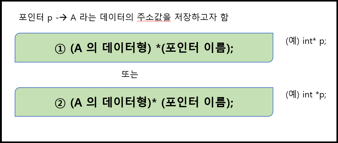 우리가 p 라는 포인터 변수를 통해 int 형 데이터 A 가 저장된 주소값을 가리키고 싶다면, int *p; (또는 int* p) 와 같이 정의하면 된다는 얘기다.