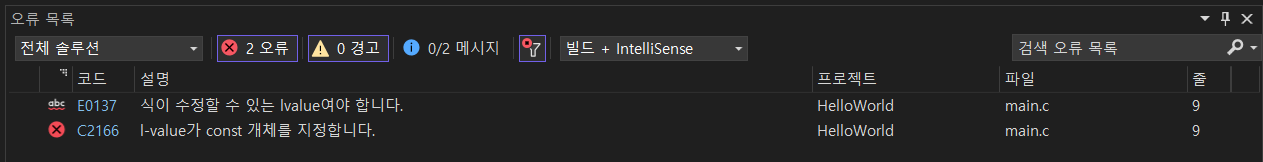 즉, 포인터 변수 pa 의 값은 절대로 바뀔수 없는 것이고, 그렇기 때문에 *pa =3 이라는 코드에서 오류가 발생하는 것이다.