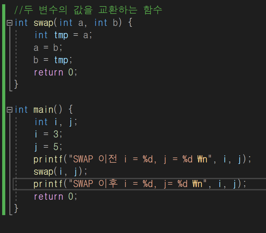 사실 함수 swap 함수 내부의 변수 a,b 와, main 함수에서 선언한 변수 i,j 가 서로 무관한 변수들임을 생각하면 오히려 i, j 의 값이 바뀌는 것이 더 이상하게 느껴진다.