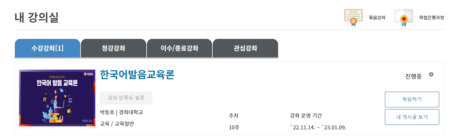 수강 신청을 위해 예시로 <한국어 발음 교육론> 강좌 수강신청을 해보겠습니다.