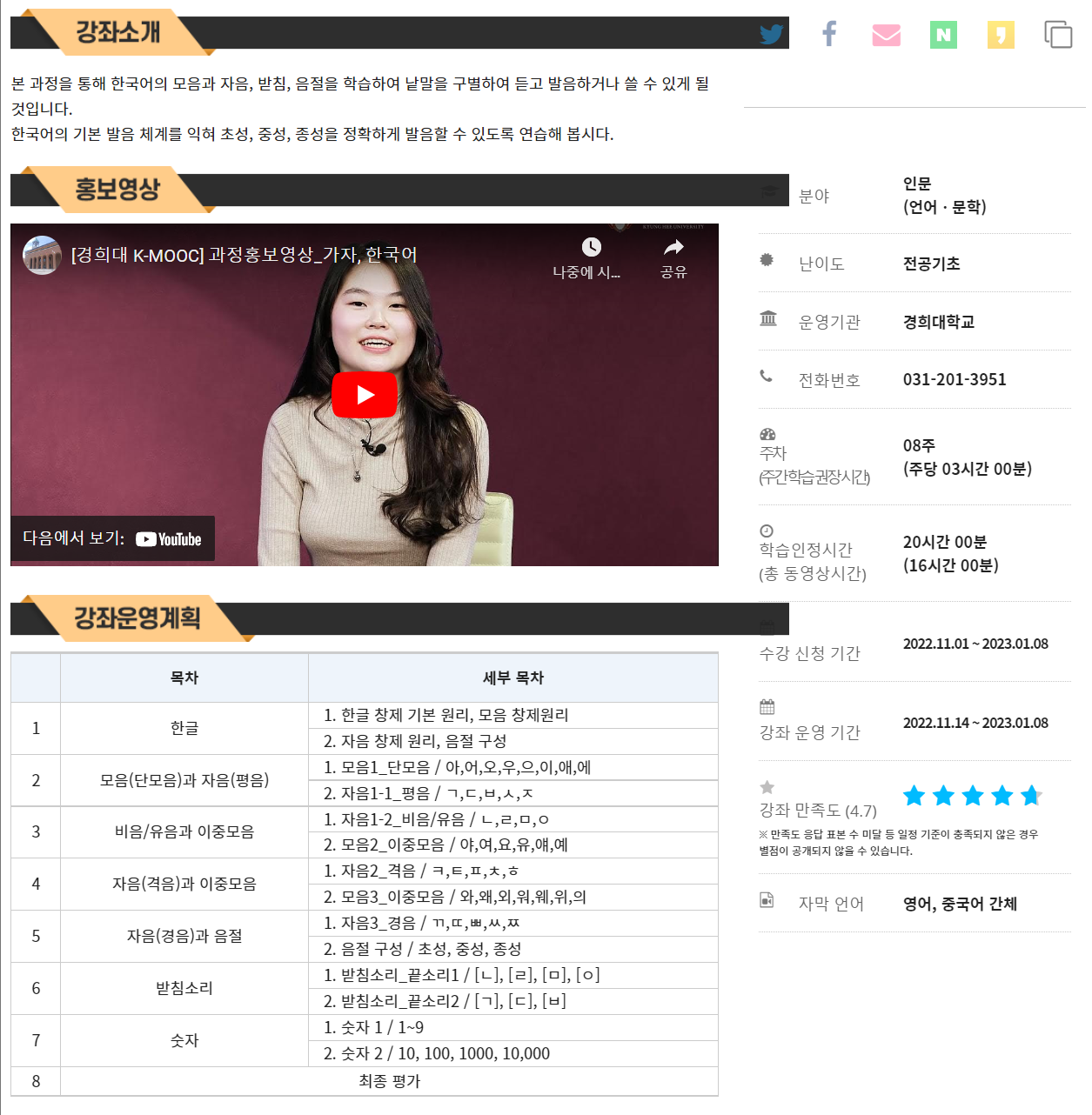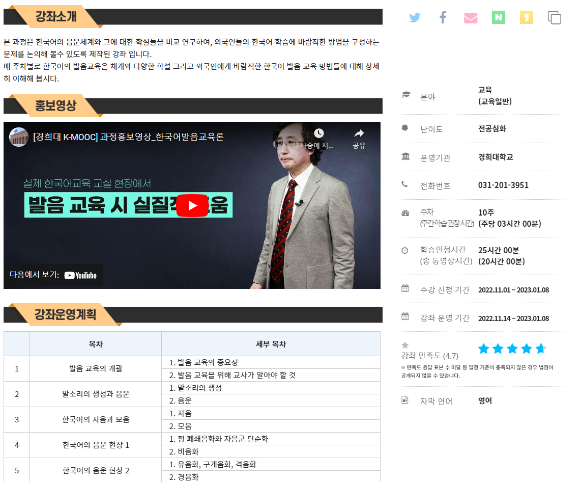 | [Club K-MOOC] 3. 경희 K-MOOC [한국어발음교육론] 강좌 소개 (0) | 2022.12.03 |