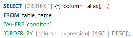 - ORDER BY : 정렬옵션(ASC : 오름차순(default), DESC:내림차순)