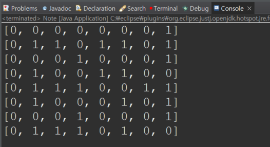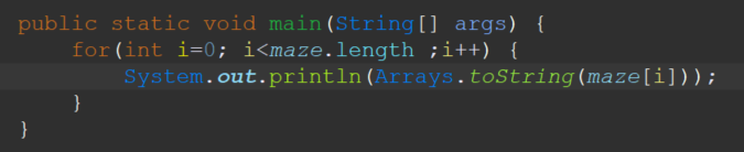 그렇기 때문에 Arrays.toString(maze) 코드를 실행했을 때 배열 maze의 원소들을 모두 출력해주었고, 다만 그것들이 배열이기 때문에 주소값을 출력해 준 것입니다.