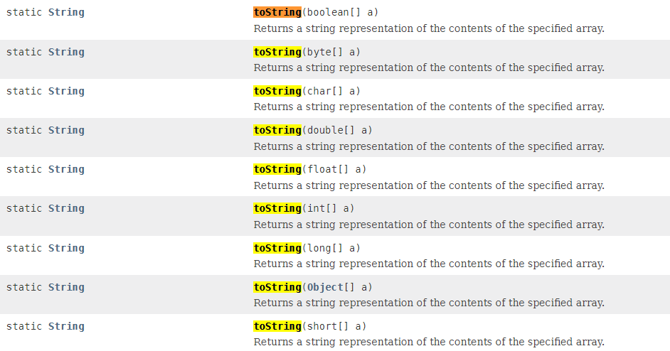자바 API 의 java.util > Arrays에 가시면 toString()메소드를 확인할 수 있습니다. (https://docs.oracle.com/javase/8/docs/api/)